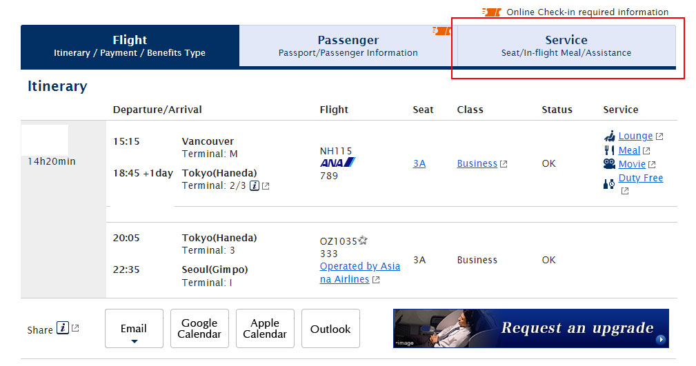예약을 하고 예약번호 확인을 했으면 좌석지정을 해야지. 나는 하네다-김포 편이 아시아나 운항이라 이 구간은 예약할때 했다. ANA 운항구간인 밴쿠버-하네다 구간의 좌석지정은 ANA항공 홈페이지에서 할 수 있다